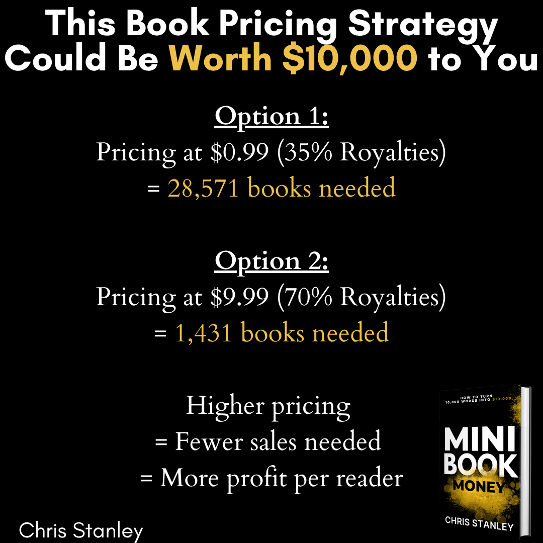 If you want to hit $10K from a single book, you need to price it inside Amazon’s sweet spot where you get maximum royalties and premium buyers.