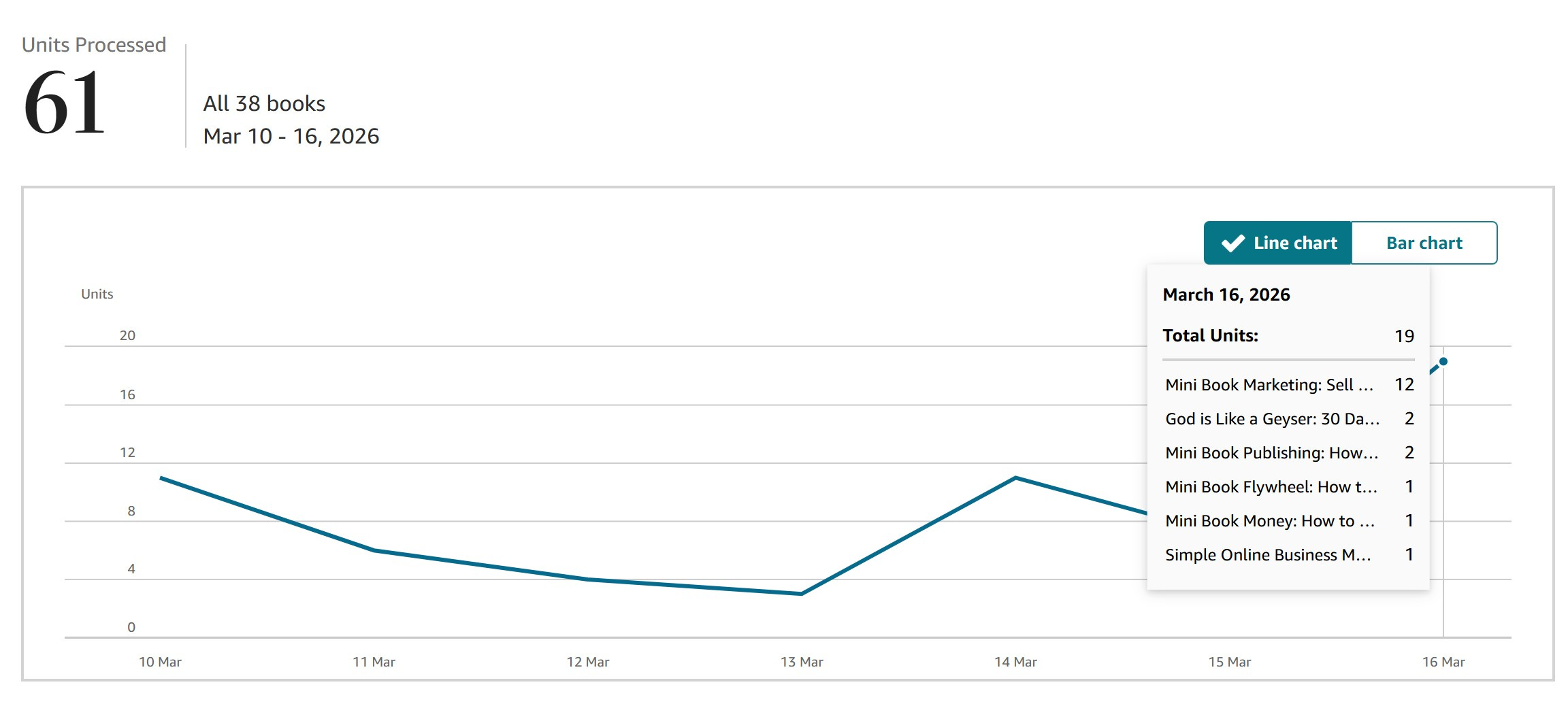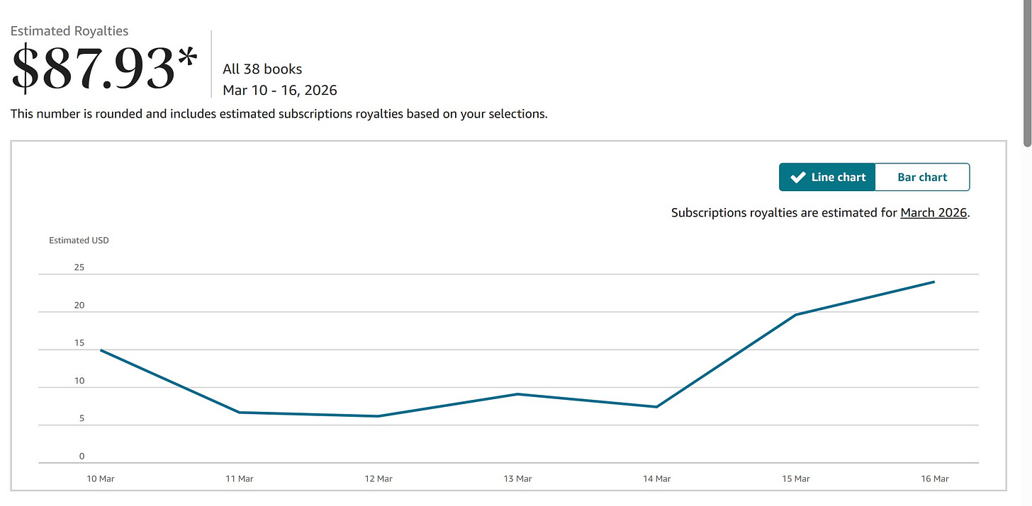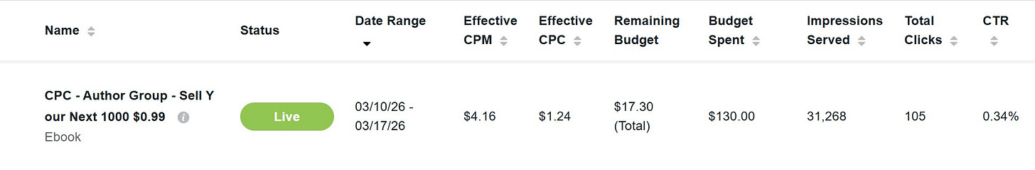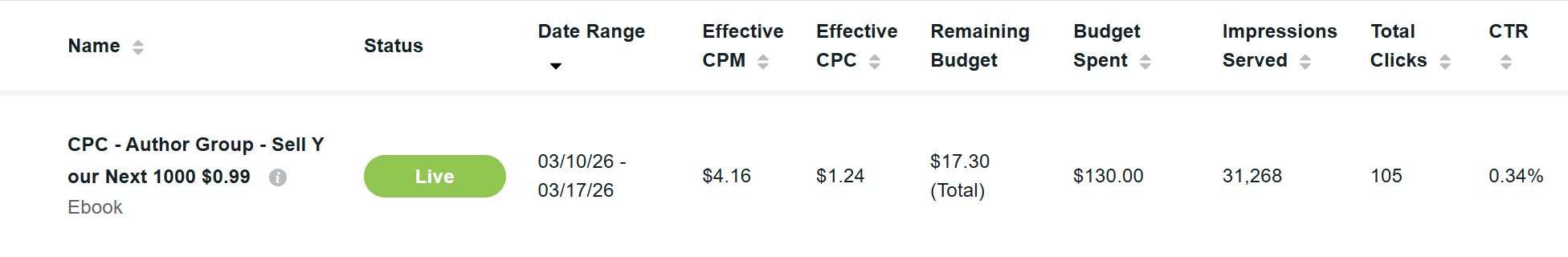 Dates Run: March 10-16, 2026 Bestseller: March 11-17, 2026 Ad Spend: $130.00 Royalties: $87.93 Net: -$42.07 Books Sold: 49 (Total in Series) Target Book Sold: 30 Average Target Per Day: 5 Cost to Acquire Customer: $0.85